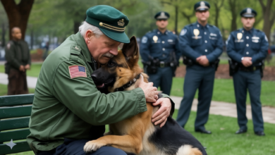 “Attack!” the officer barked. The command sliced through the afternoon air like a whip. The German Shepherd at his side surged forward, muscles tense, jaws ready. Bystanders gasped, children cried, parents clutched them tighter. All eyes fixed on the trembling old man sitting on the park bench, his hands raised…