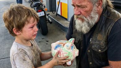 It happened on an ordinary afternoon at a gas station, the kind of place people pass through without remembering, until a moment turns it into something permanent. I had just finished fueling my motorcycle when I felt a light tug on my leather vest. I turned and saw a little…