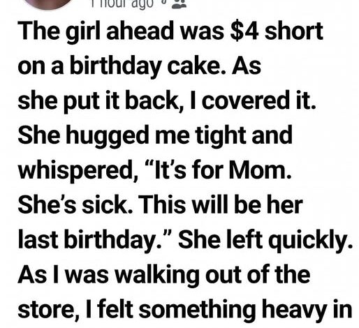 Impulse took over before my brain could process the math. I stepped forward, swiped my card, and told the cashier to put the cake on my tab. The girl froze. When she looked up at me, the expression wasn’t just one of surprise; it was a profound sense of relief that seemed to vibrate through her small frame. Without a word, she lunged forward and hugged me. It was a desperate, honest embrace that smelled like laundry detergent and outside air. “It’s for my mom,” she whispered into my coat, her voice thick with unshed tears. “She’s not feeling well, and I just wanted to make today special.”